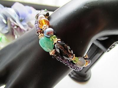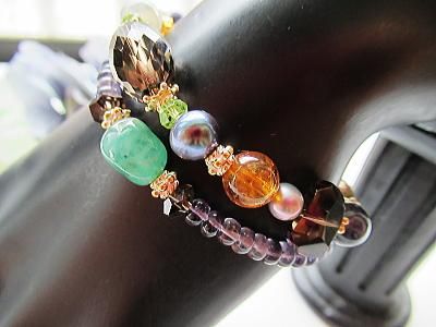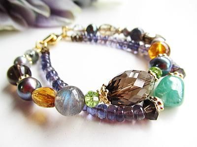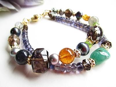 美しいカットと多色性が魅力のアンダルサイト、グレーカラーの淡水パール、シトリンに大粒スモーキークォーツ、ラブラドライト、ガーデンクォーツを使用し、2連目にはアイオライト、エメラルドを使用しブレスレットにしました。