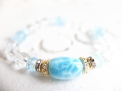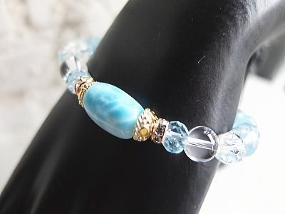 美しい波紋の現れた高品質太鼓型ラリマー、宝石質ブルートパーズ、アクアマリン、天然水晶をつなぎゴムでブレスレットにしました。