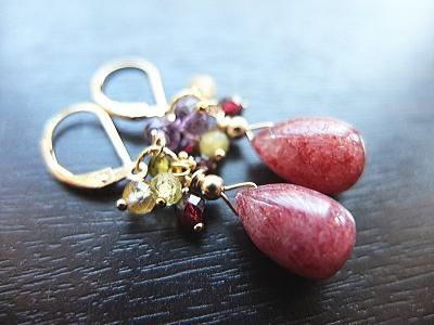 モスコバイトをメインに、ガーネットとアメジスト、グリーンアベンチュリン、ルチルクォーツを使用し14金ゴールドフィルドパーツでピアスにしました。