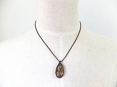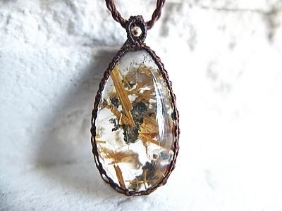 石の中に黒いヘマタイトと極太金針ルチル、ヘマタイトインルチルクォーツのルースを使いマクラメ編みで仕上げたペンダントです。