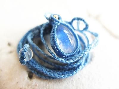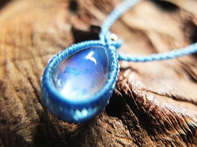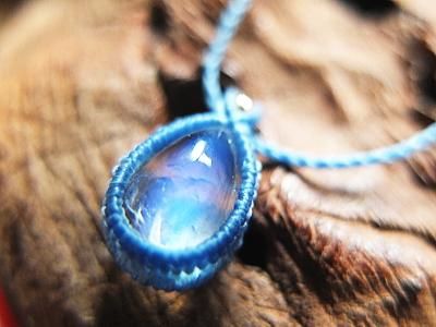 ブルーシラーが美しい宝石質ブルームーンストーンのペンダントです。ポリエステルの紐でマクラメ編みに仕上げてあります。