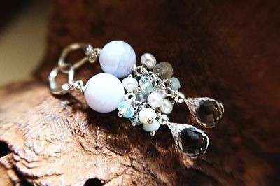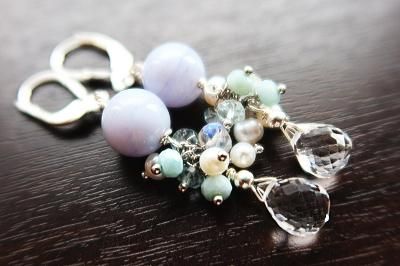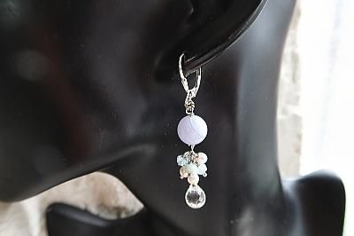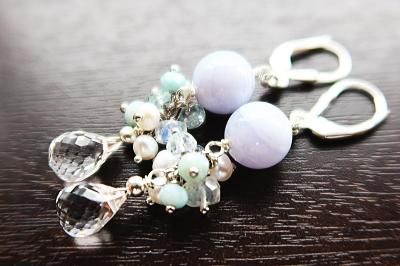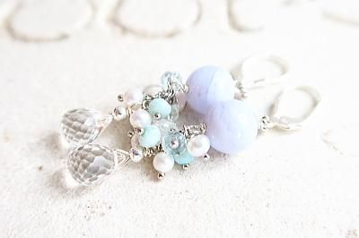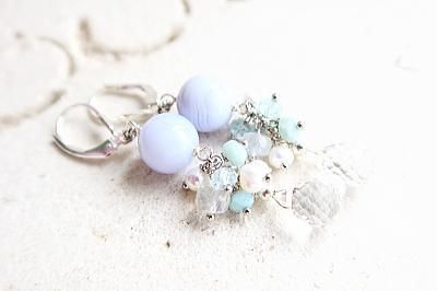 美しいブルーレースアゲート、宝石質アクアマリン、ムーンストーン、淡水パール、天然水晶を使用しピアスしました。