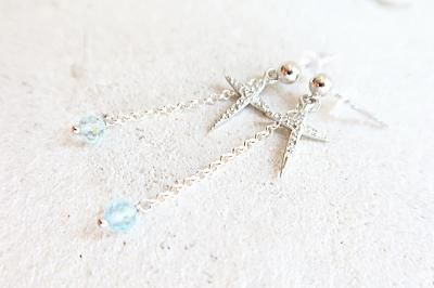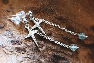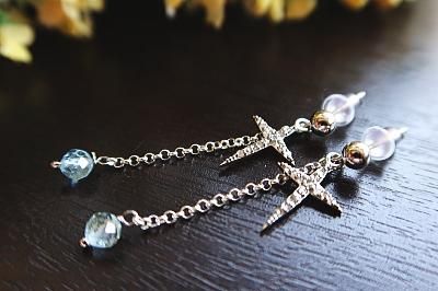 Silver925製の枠に天然のダイヤモンドがちりばめられた総ダイヤモンド仕上げのクロスチャームとブルートパーズを使用したピアスです。