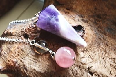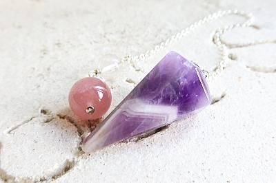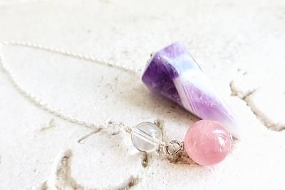 T様オーダーヒーリング効果が非常に強く直観力を高める石、マイナスエネルギーを浄化し、希望の光で心を満たすアメジスト、心を愛で満たし女性性の魅力を最大に引き出すディープローズクォーツペンデュラム