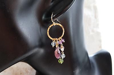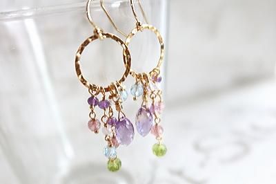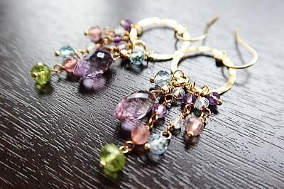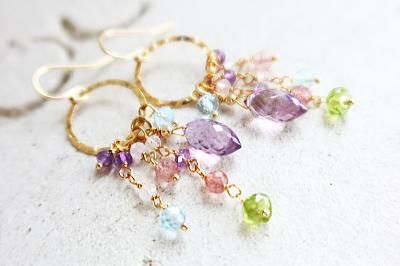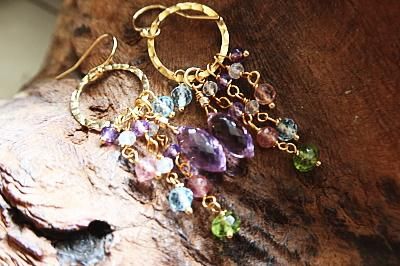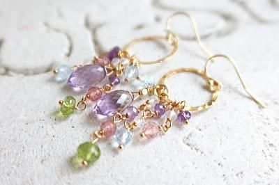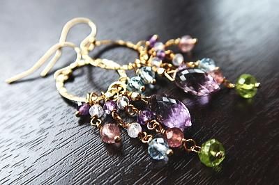 美しいアメジスト、ブルートパーズ、ピンクエピドート、ペリドットを使用し14金ゴールドフィルドパーツで存在感のあるピアスにしました。