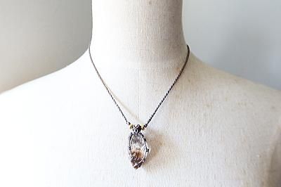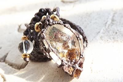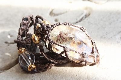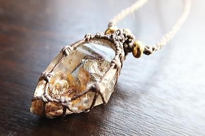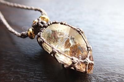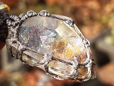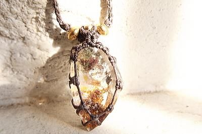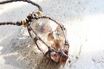 希少なレインボーとヘマタイト入りブラジル産大粒クォーツインクォーツのルースを使用したマクラメ編みペンダントです。