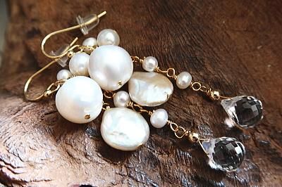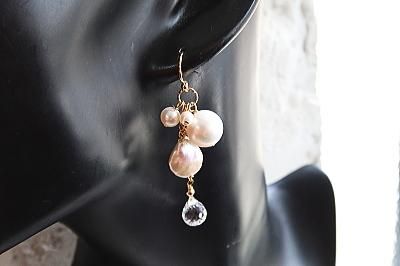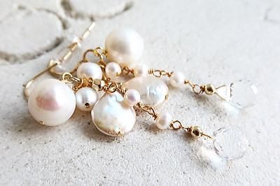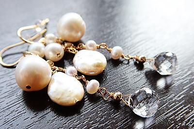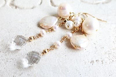 様々な形の淡水パールと天然水晶を使用しました。