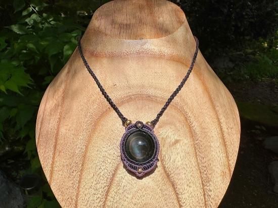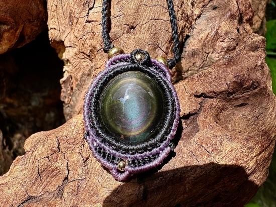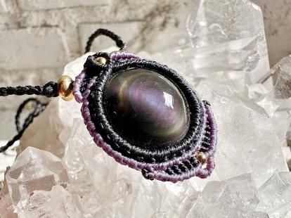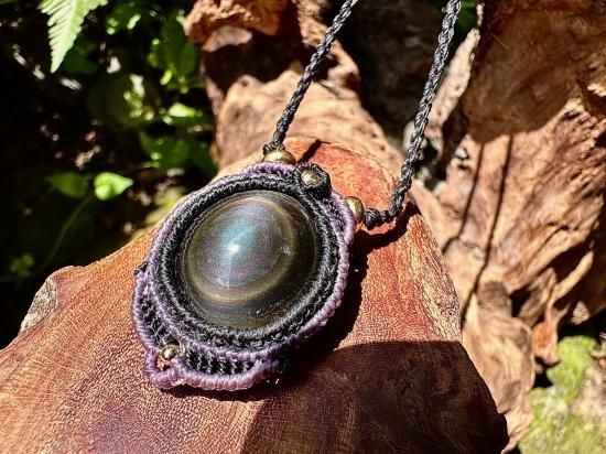 高品質なレインボーオブシディアンの大粒ルースを使用したマクラメ編みネックレスです。