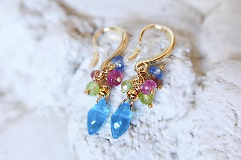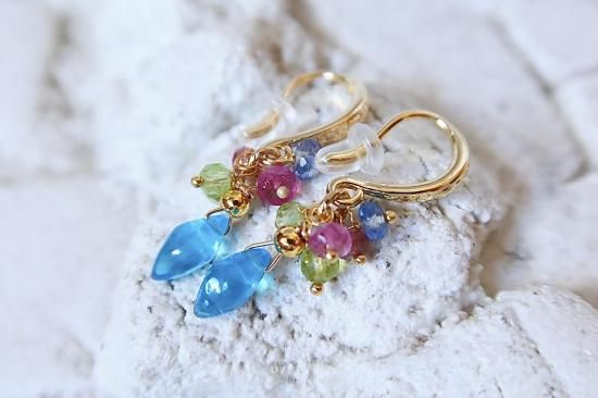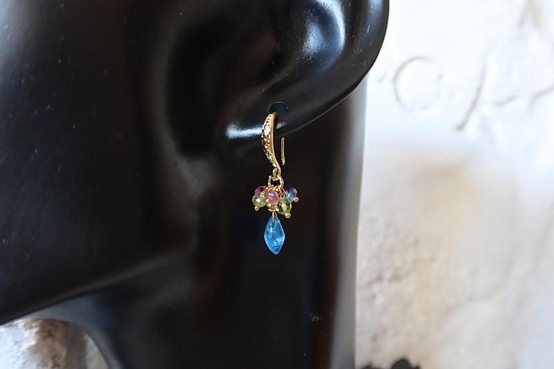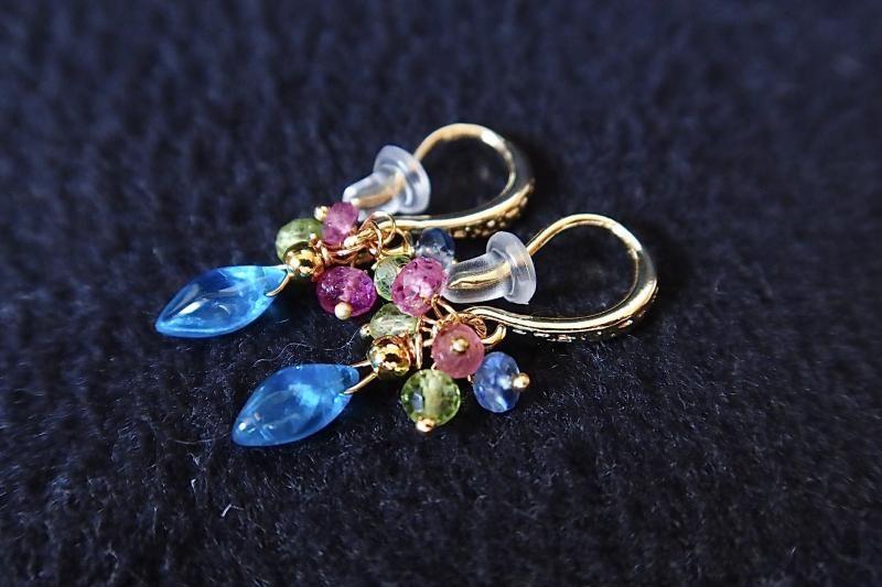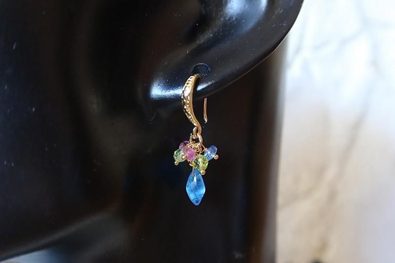 目が覚めるような美しいブルーの宝石質アパタイトと小粒のペリドット、ピンクトパーズ、カイヤナイトを使用したピアスです。