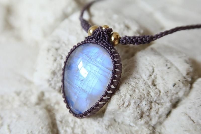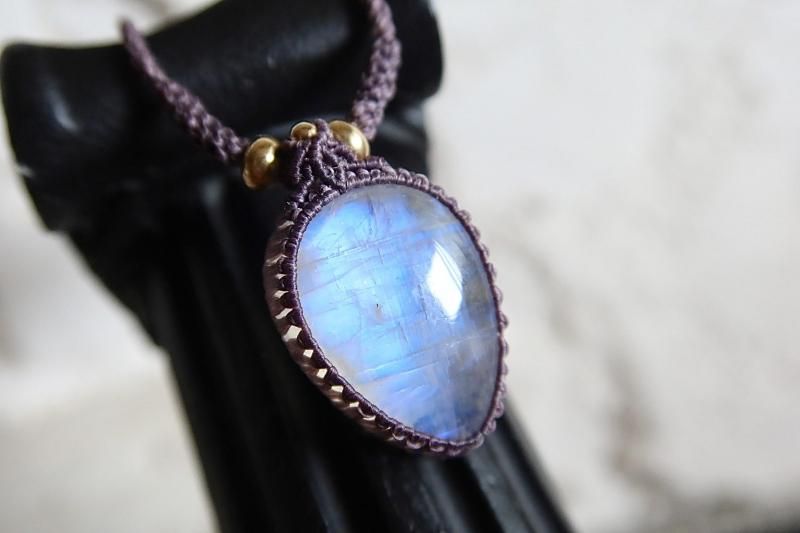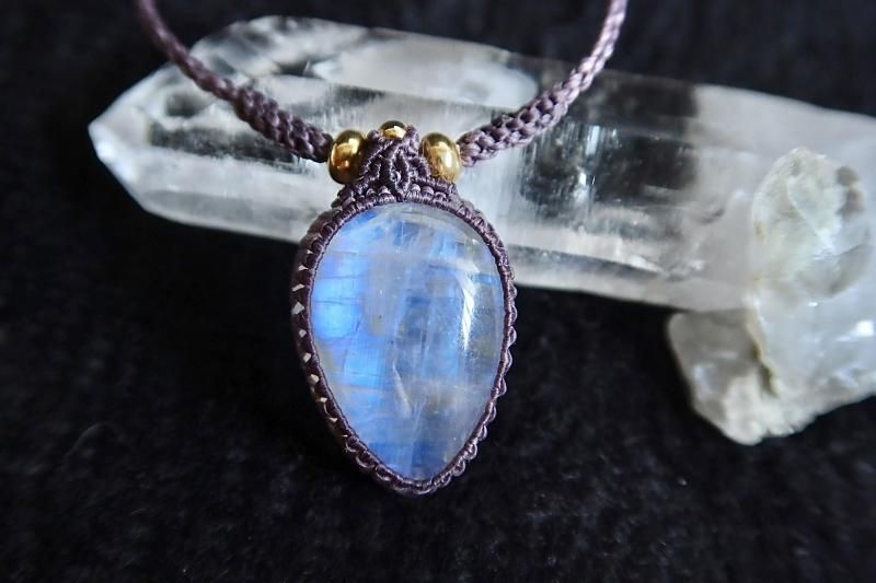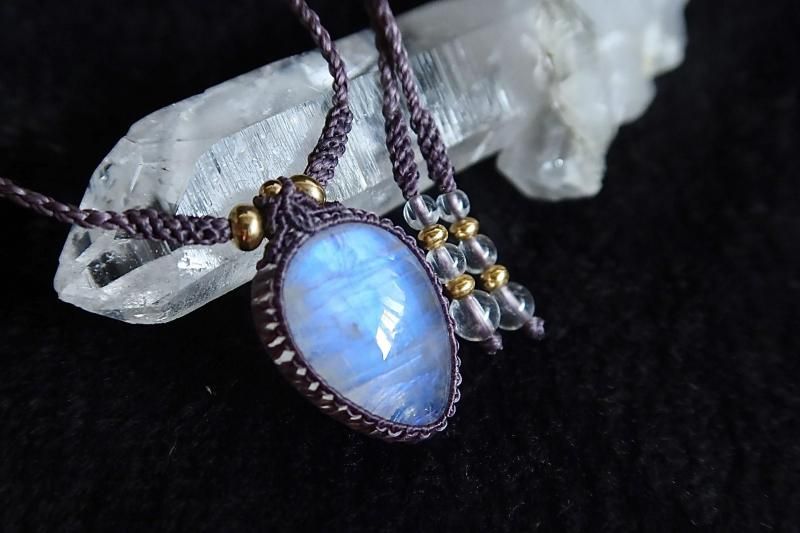 皆既月食&満月の夜にパワーを込めて編んだ宝石質インド産ムーンストーンマクラメ編み 愛する人との出会いと恋愛成熟のお守り、持ち主や家族や親しい友人を危険から守ってくれる石